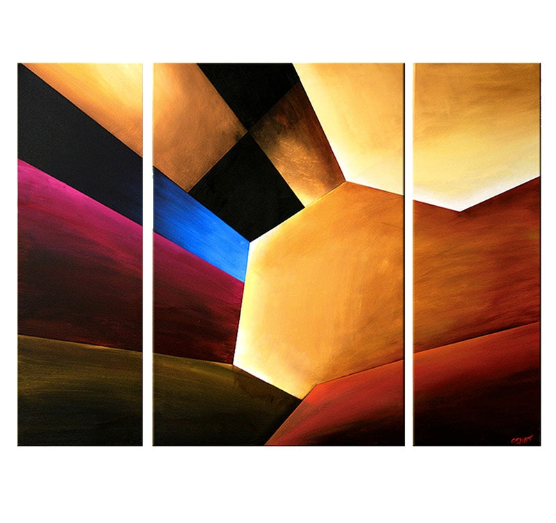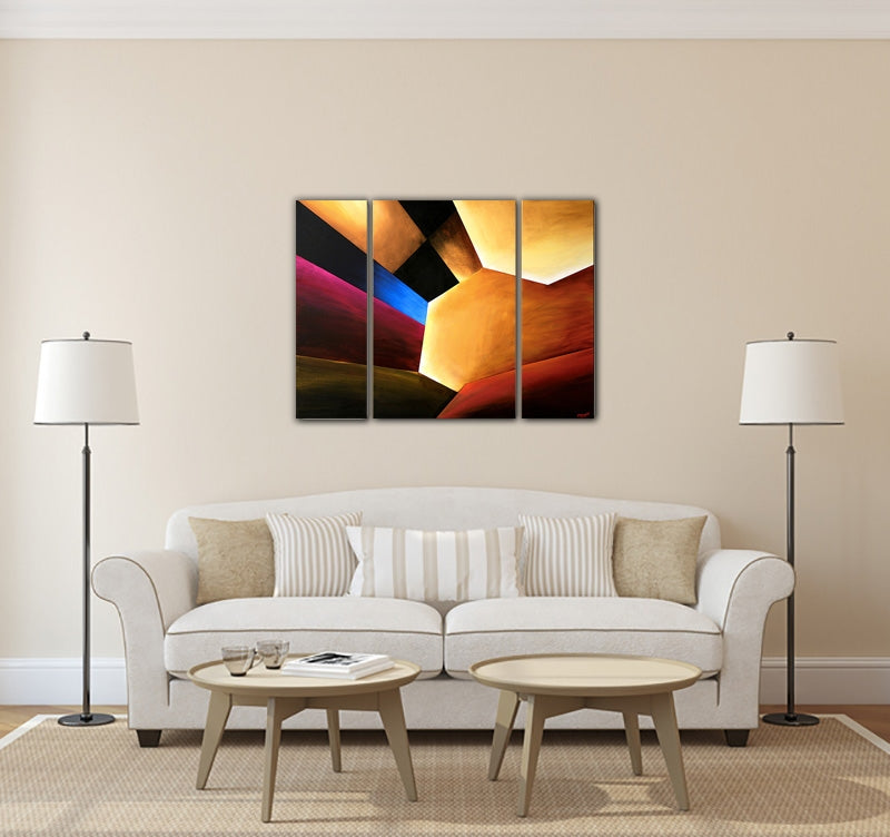 In three boards, this paint wall decoration proposes a maze of geometrical shapes for a design and trendy interior. This multiple paint canvas will perfectly match a coloured and modern ambiance to become the centrepiece of your interior decoration. The brush strokes will give some relief to your walls thanks to this geometrical abstract painting looking like an artistic canyon. Red, blue and yellow will light up your wall decoration while offering an off-the-wall deco triptych. The decorative wall canvases of this category are painted on a cotton canvas and stretched on a Canadian pinewood frame so the picture is ready-to-hang. This canyon paint canvas is delivered wrapped and with cardboard corners and hanging system. All the design triptychs of the abstract paint canvas category are original works guaranteeing a long-lasting quality and finish.