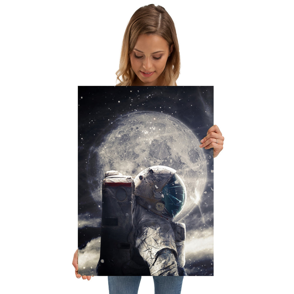 Amazing shot in a metal wall poster depicting an astronaut who looks extremely close to the moon flickering with a flaming silver and surrounded by a multitude of stars ! Utopian and pensive universe that leaves room for calm and serenity. For fans of the sky and all its unknown treasures, this unique work, both dark and luminous, will transport you and give a touch of sparkle to your interior decoration. You just have to stick on the wall the magnet and let the metal poster merge with it, no hole or screw ! An authentication hologram and the signature of the workshop manager is present on the back of the metal poster to authenticate this unique piece that will find its place in your decor.