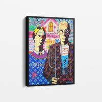 Redécouvrez l'iconique "American Gothic" sous un angle audacieux et moderne avec notre tableau "Gothic Royalty". Ce tableau vibrant et provocateur mêle des éléments de l'art classique avec des symboles contemporains de la culture populaire, créant une œuvre unique qui interpelle et fascine. Imprimé sur toile et tendu sur un châssis en bois, ce tableau présente un duo emblématique habillé de motifs de luxe et entouré de graffitis colorés, offrant une nouvelle perspective sur les thèmes de l'amour, de l'argent et du pouvoir.