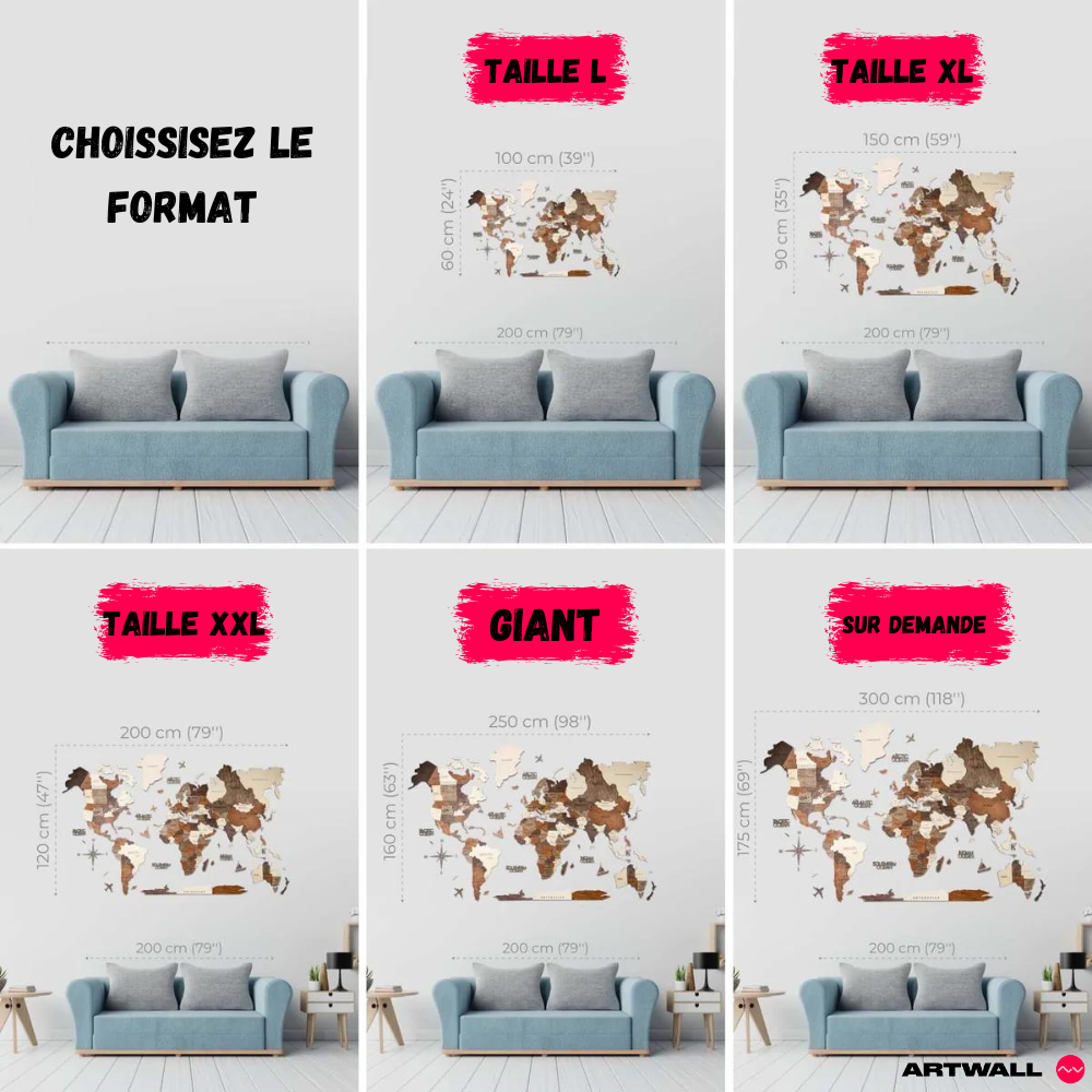 Découvrez notre version originale de carte en bois 3D ! Cette représentation unique vous permet d'avoir une vue d'ensemble sur le monde et rêver de vos prochains voyages. Les adeptes de photo pourront coller leurs souvenirs sur chaque pays afin d'apporter une touche personnelle.Entièrement réalisée à la main, cette décoration murale est composée de contreplaqué de bouleau de plusieurs couleurs avec un effet en relief. Une qualité irréprochable qui s'installera parfaitement sur les murs de votre salon ou de votre chambre. Idéal pour un style boho ou scandinave, cette pièce d'art sera l'œuvre centrale de votre maison.Le nom des pays ainsi que les frontières sont présent pour vous offrir une carte du monde ultra réaliste.Différentes tailles disponibles :L - 100x60 cm XL - 150x90 cm, XXL ou Giant. Il faut compter environ 5 à 6 jours pour la création de la carte.