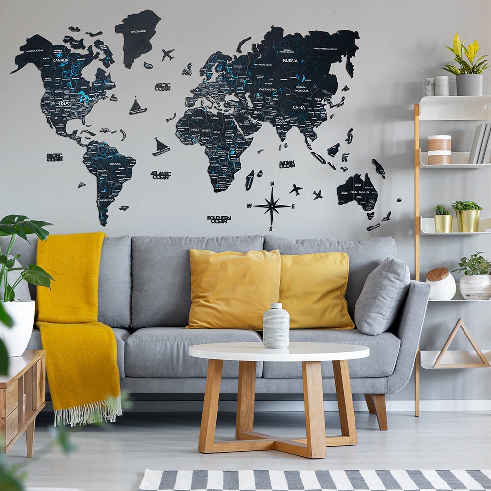 Voici Le cadeau par excellence pour les amateurs de voyage et de décoration murale design ! Découvrez cette version noire notre carte du monde entièrement réalisée en bois par nos artistes pour votre décoration murale.Tous les pays sont représentés pour vous donner une mappemonde originale et moderne tout en gardant un aspect naturel. Chaque pays est délimité et son nom est inscrit en Français.Cette carte du monde en bois noir est disponible en plusieurs couleurs sur la boutique Artwall and Co dans la catégorie carte du monde en bois.L’aspect de cette carte du monde est très lisse et s’adaptera très facilement à votre décoration intérieure grâce à une qualité unique en contreplaqué de bouleau.Pour une installation simplifiée, chaque partie de notre carte murale en bois contient des adhésifs au dos, qui vous permettront de réaliser ce planisphère. Il est très facile d’utilisation et n’abimera pas vos murs.Taille de la carte du monde : 100 x 60 cmAttention : Attacher une carte à de la tapisserie ou du papier peint va endommager vos murs tout comme sur certains types de peinture. Merci de bien vous renseigner sur votre surface.Nous vous proposons aussi des pins en forme d’avion en papier qui vous permettent de marquer tous les pays ou vous avez voyagé sur la carte ! Vous pouvez les retrouver en cliquant ici : Pins Metal AvionVotre carte du monde en bois est livrée dans en plusieurs parties. Nos instructions vous permettront d’installer pas à pas les différentes pièces. Il faut compter environ 1 heure pour réaliser complètement cette carte du monde en famille.