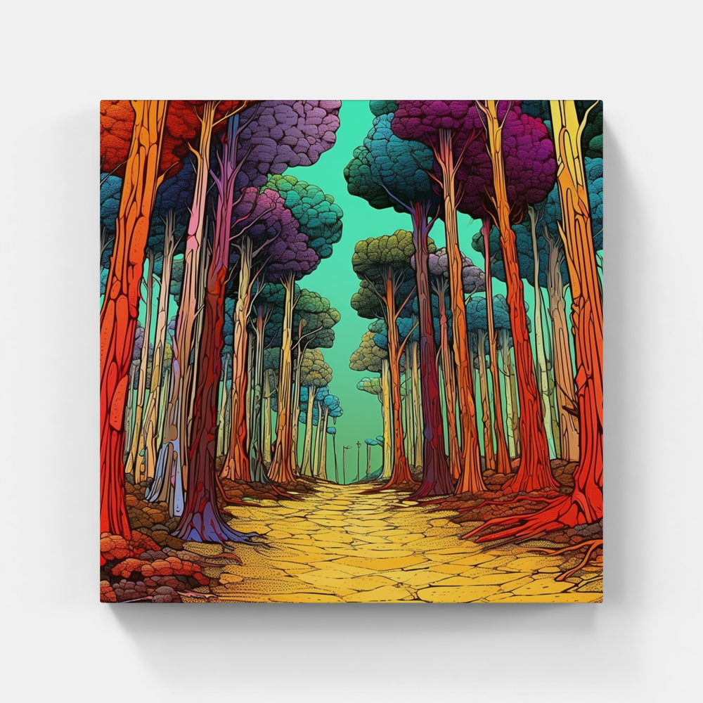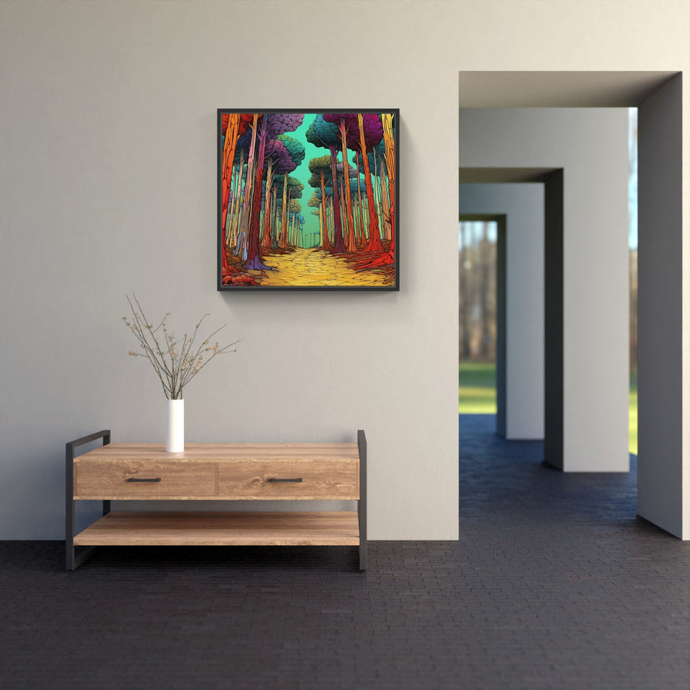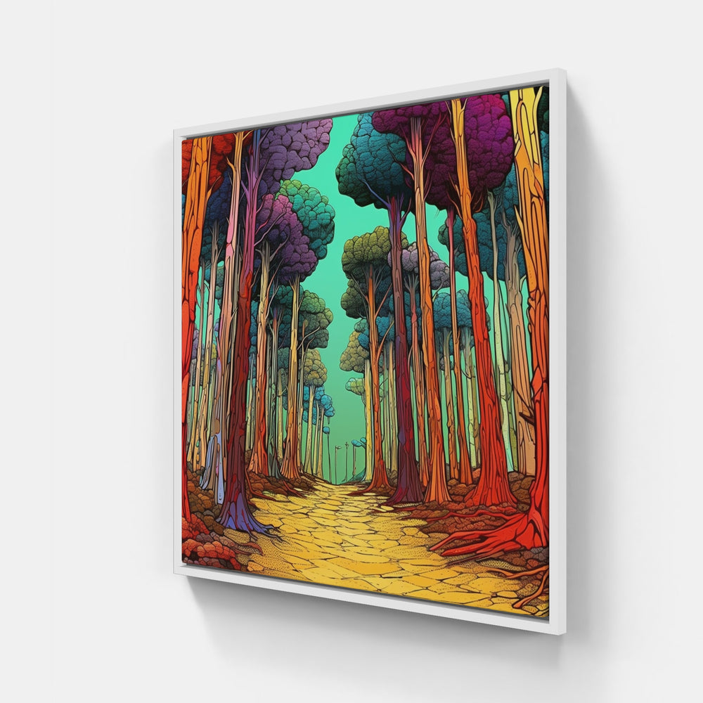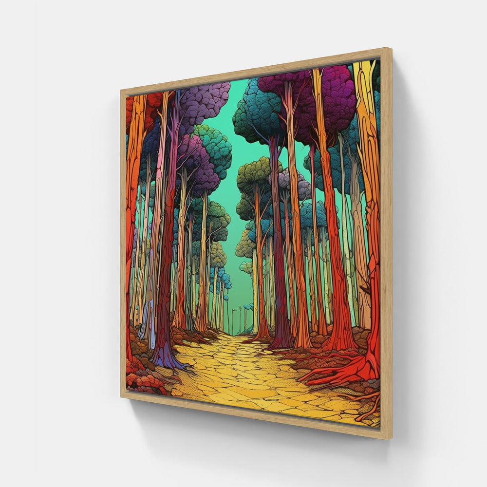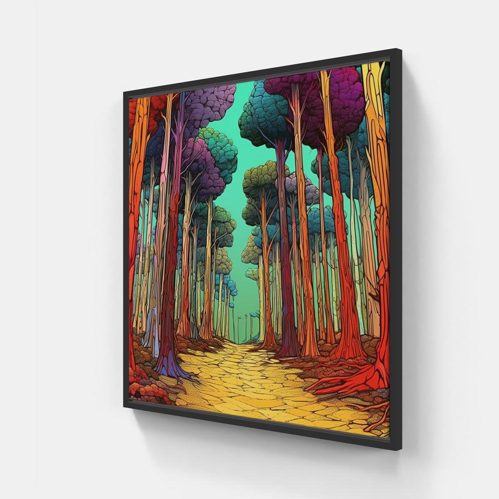 Embarquez pour un voyage à travers les bois avec cette captivante canva imprimée sur le thème de la forêt. Son design serein et ses teintes luxuriantes vous transportent dans une retraite naturelle sereine.