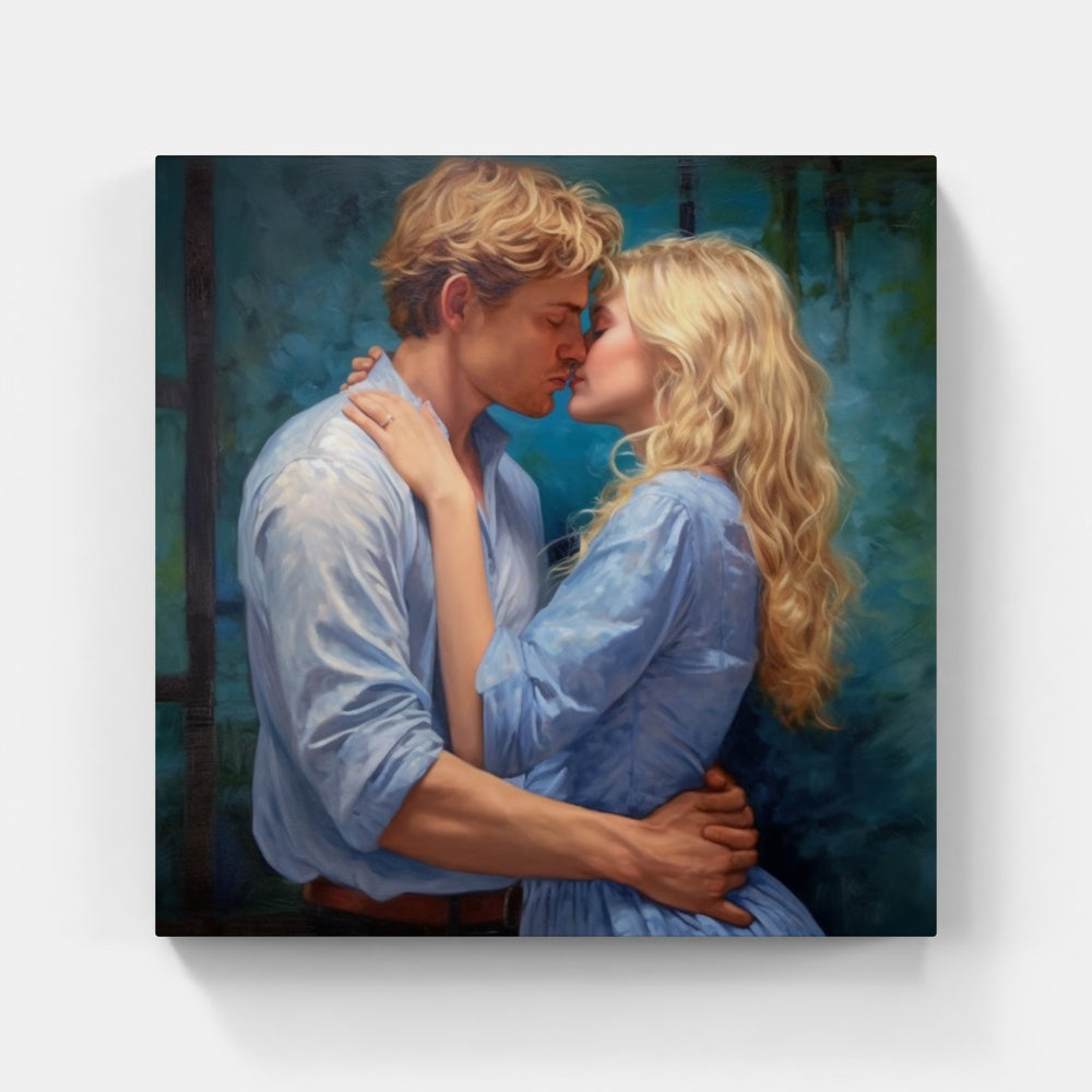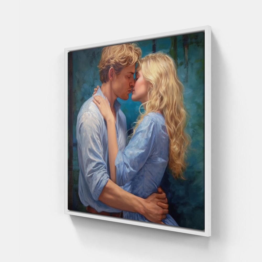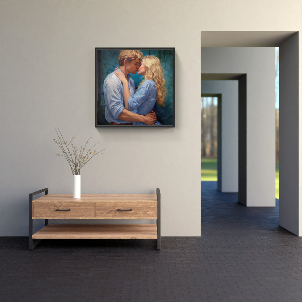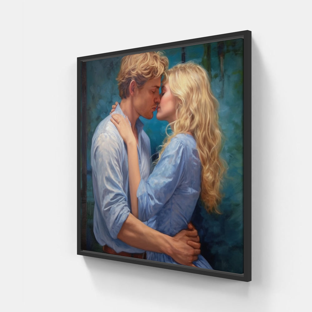 Rencontre romantique capturée sur canva imprimé : homme et femme s'embrassant. Embrassez l'essence de l'amour avec cette œuvre d'art intime.